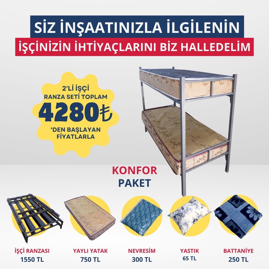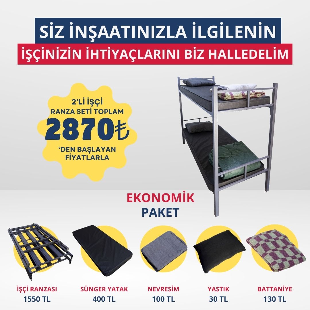 İnşaat ve diğer şantiye projelerinizde işçilerinizin rahatı bize emanet. Siz şantiyenizle ilgilenin, biz işçilerinizin ihtiyaçlarını giderelim. İşçi ranzalarımızla çalışanlarınızın konforunu uygun fiyatlarla sunuyoruz. İşçi ranza setimizde farklı kalitelerde yatak, battaniye, nevresim, yastık ürünlerimiz mevcuttur. İşçi ranzamız kolay kurulumludur ve şantiyenizin ihtiyaçlarına göre tasarlanmıştır.